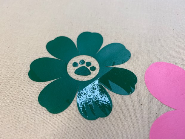 First off we need to make the design in Cricut Design space, I found two flower templates and this cute paw print in a circle, then I spliced the two together to leave the silhouette of the paw print inside the flower. I then duplicated the design so I had 4 of each flower, popping them in each corner. I mixed up the sizing of the flowers to add a bit of interest.